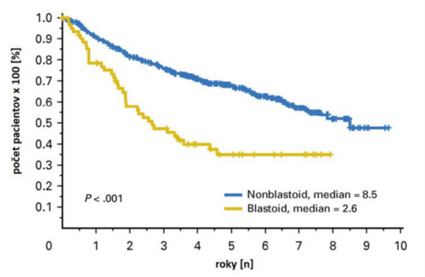 Obrázok 1: Celkové prežívanie (OS) pri blastoidnej a non-blastoidnej forme MCL.