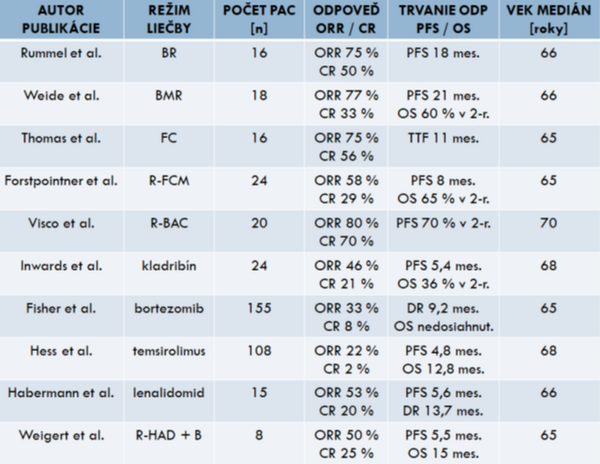 BR – bendamustín, rituximab; BMR – bendamustín, mitoxantrón, rituximab; FC – fludarabín, cyklofosfamid; R-FCM – rituximab, fludarabín, cyklofosfamid, mitoxantrón; R-BAC – rituximab, bendamustín, cytarabín; R-HAD + B – rituximab, cytarabín, dexametazón, bortezomib; ORR – celkový počet odpovedí; CR – kompletná remisia; PFS – prežitie bez progresie; TTF – čas do zlyhania liečby; DR – trvanie odpovede; OS – celkové prežitie