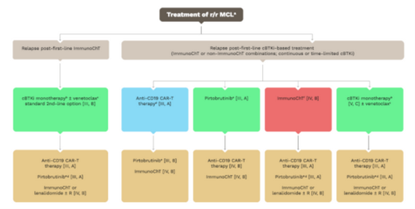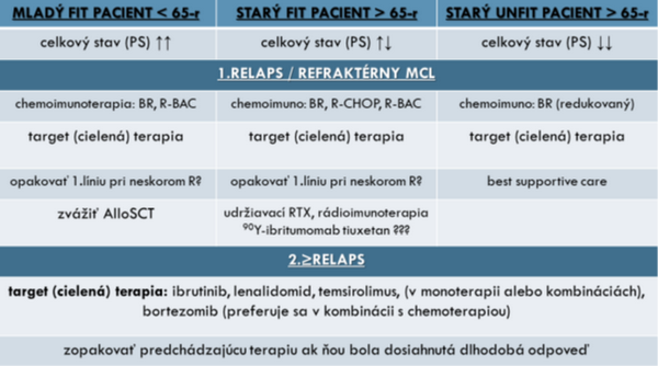 Liečba relabujúceho MCL predstavuje výzvu pre pacienta ako aj pre lekára. Napriek zlepšujúcim sa výsledkom liečby MCL v 1. línii dochádza nakoniec skôr či neskôr k relapsom a progresii. Pre tieto prípady nie je zatiaľ stanovená žiadna uniformná štandardná liečba a postupy. K dispozícii máme niekoľko režimov (Tabuľka). Tak ako v 1. línii výber optimálneho režimu pre relabujúcich / refraktérnych (R/R) pacientov s MCL závisí nielen od veku, ale hlavne od celkového stavu výkonnosti a pridružených komorbidít. Treba zohľadniť nielen spektrum vedľajších účinkov nasledujúcej liečby ale aj toleranciu predchádzajúcich podaných režimov a trvaním odpovede na ne. S nástupom cielenej liečby (BTKi) a imunoterapie (napr. CAR T-bunková liečba) a ich zaraďovaním do terapeutických algoritmov sa prirodzene mení pohľad na staršie liečebné režimy ako aj sekvencia jednotlivých liekov v čase.