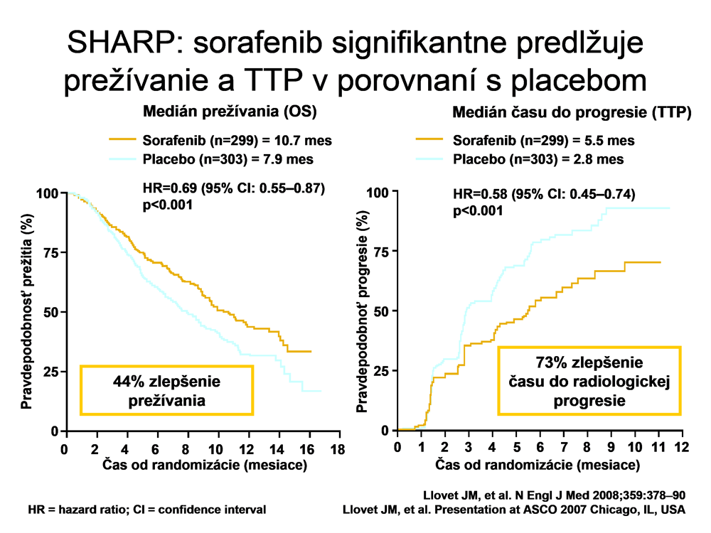 Výsledky dvoch randomizovaných klinických štúdií fázy III SHARP a Ázia – Pacifickej potvrdili, že sorafenib predlžuje prežívanie pacientov s hepatocelulárnym karcinómom s Child-Pugh A na 10,7 mesiacov v porovnaní s placebom. (3,4) Primárnym cieľom štúdií bolo celkové prežitie pacienta (OS). V štúdii SHARP, 602 pacientov s HCC, ktorí nedostali systémovú liečbu užívali sorafenib 2x denne 400 mg alebo placebo až do progresie ochorenia, alebo ak mali život ohrozujúcu toxicitu. Pacienti liečení sorafenibom prežívali 10,7 mesiaca a liečení placebom 7,9 mesiaca (HR:0,69; p< 0,001). Súčasne mali pacienti dlhší čas do progresie ochorenia (5,5 vs. 2,8 mes, p<0,001).